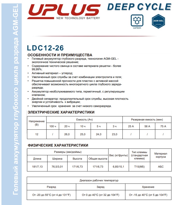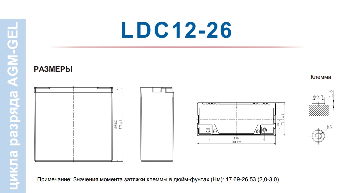 • Увеличенный срок хранения за счет низкого саморазряда. Клеммы М5